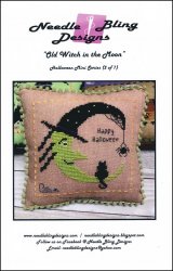 Cross stitch pattern from Needle Bling Designs. This is chart 2 of 7 in the Halloween Mini Series. On the night of Halloween, you look up into the sky to see an old witch moon in the sky. Hanging from her tall black hat is a creepy, crawly spider & a black cat sitting below her nose. Happy Halloween from "Old Witch in the Moon." Stitch count is 62H x 64W.
